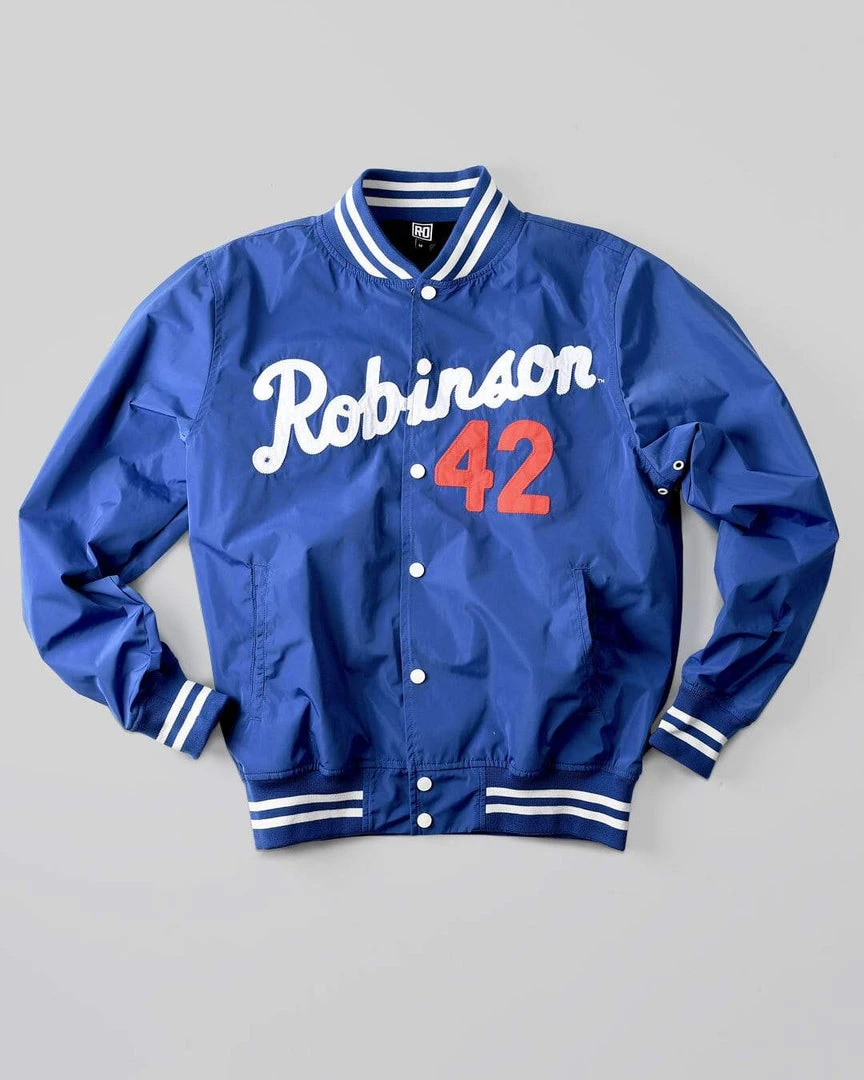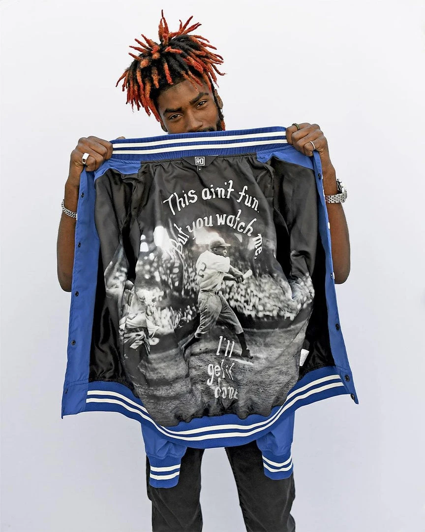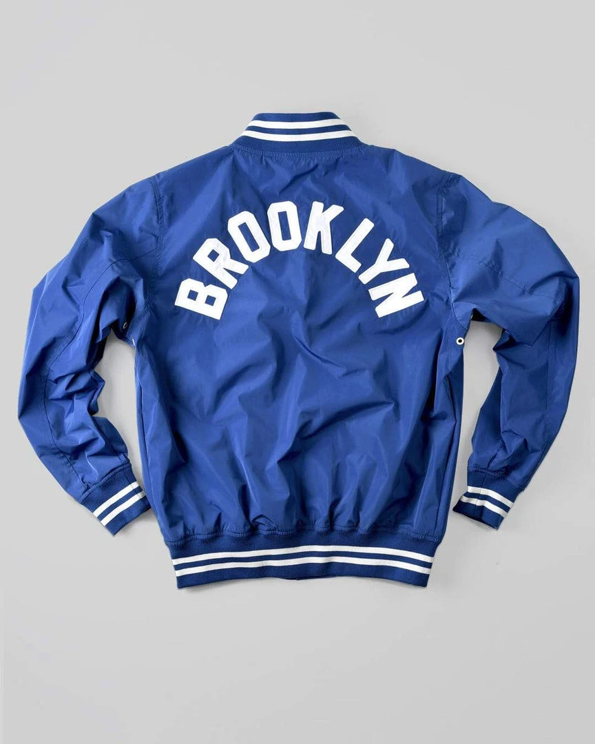Marquee players. Bigtime names. Electric threads in the roots of history. Constructed with plain weave fabric, these jackets are 100 percent polyester with a slick, water repellent exterior that shines under the lights. Featuring 1 x 1 ribbing on the collar, cuffs, and hems and double welt pockets, a snap front enclosure, and metal eyelets, the graphic inner linings tell a personal story of each icon.